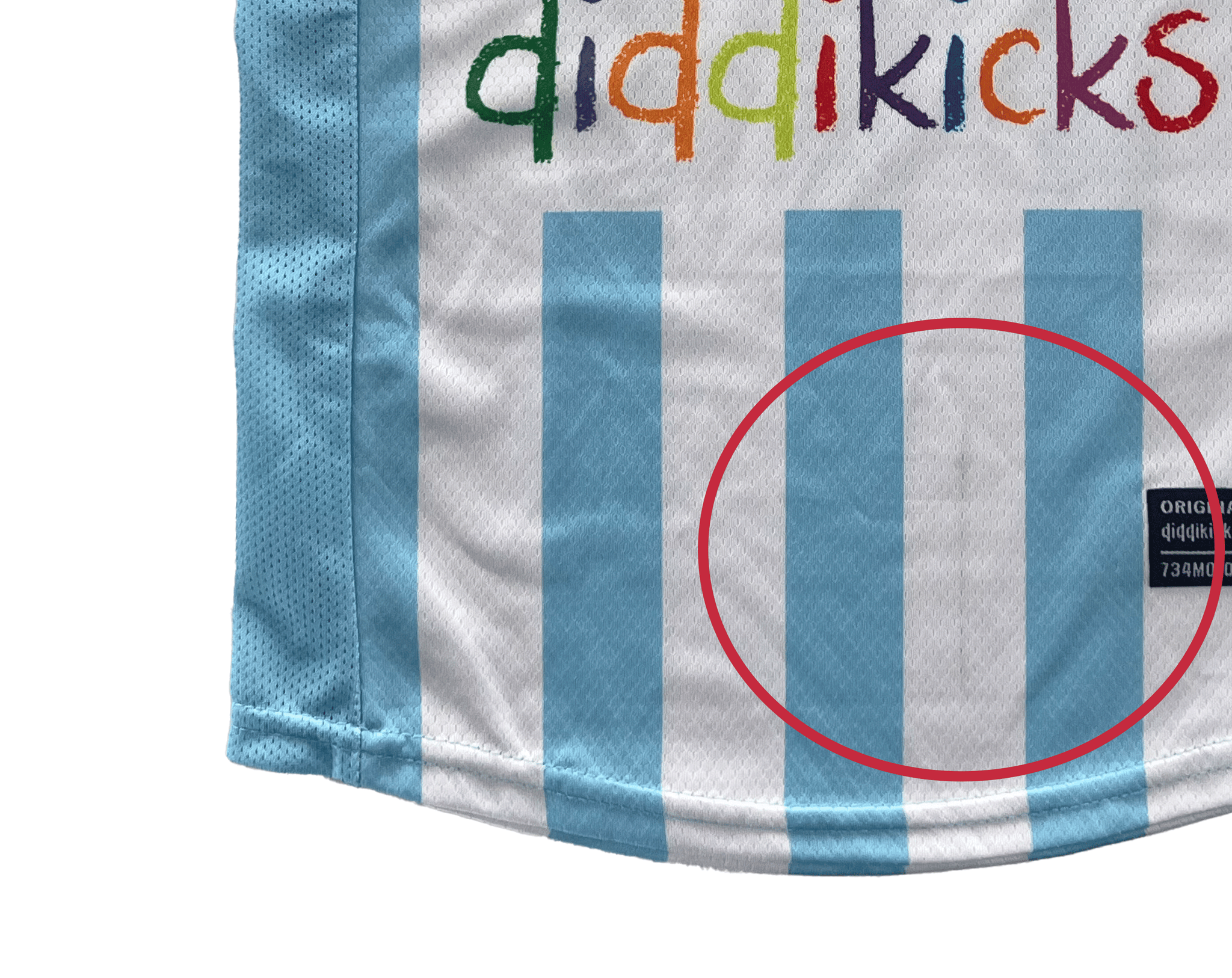 Mark on the front of the shirt. Circled in image 2.